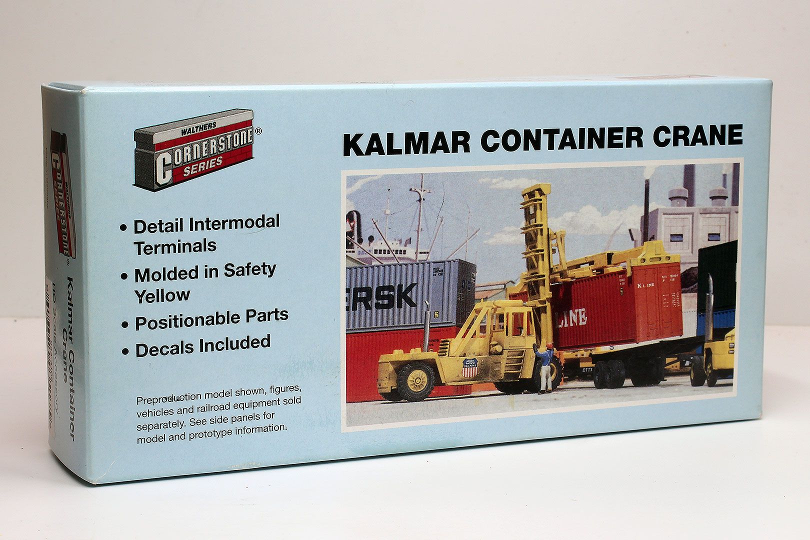 The Walthers Cornerstone HO Scale Kalmar Intermodal Container Crane is patterned after machines used in railroad intermodal yards since the 1970s. To speed loading and unloading of containers, railroads use these self-propelled giants to place piggyback trailers and containers on rail cars. These mobile cranes are used for side loading or unloading and are especially well-suited to smaller terminals. This intermodal container crane model is an ideal addition to your layout's container yard. The Kalmar Intermodal Container Crane is one of many Cornerstone and SceneMaster HO Scale vehicles.
